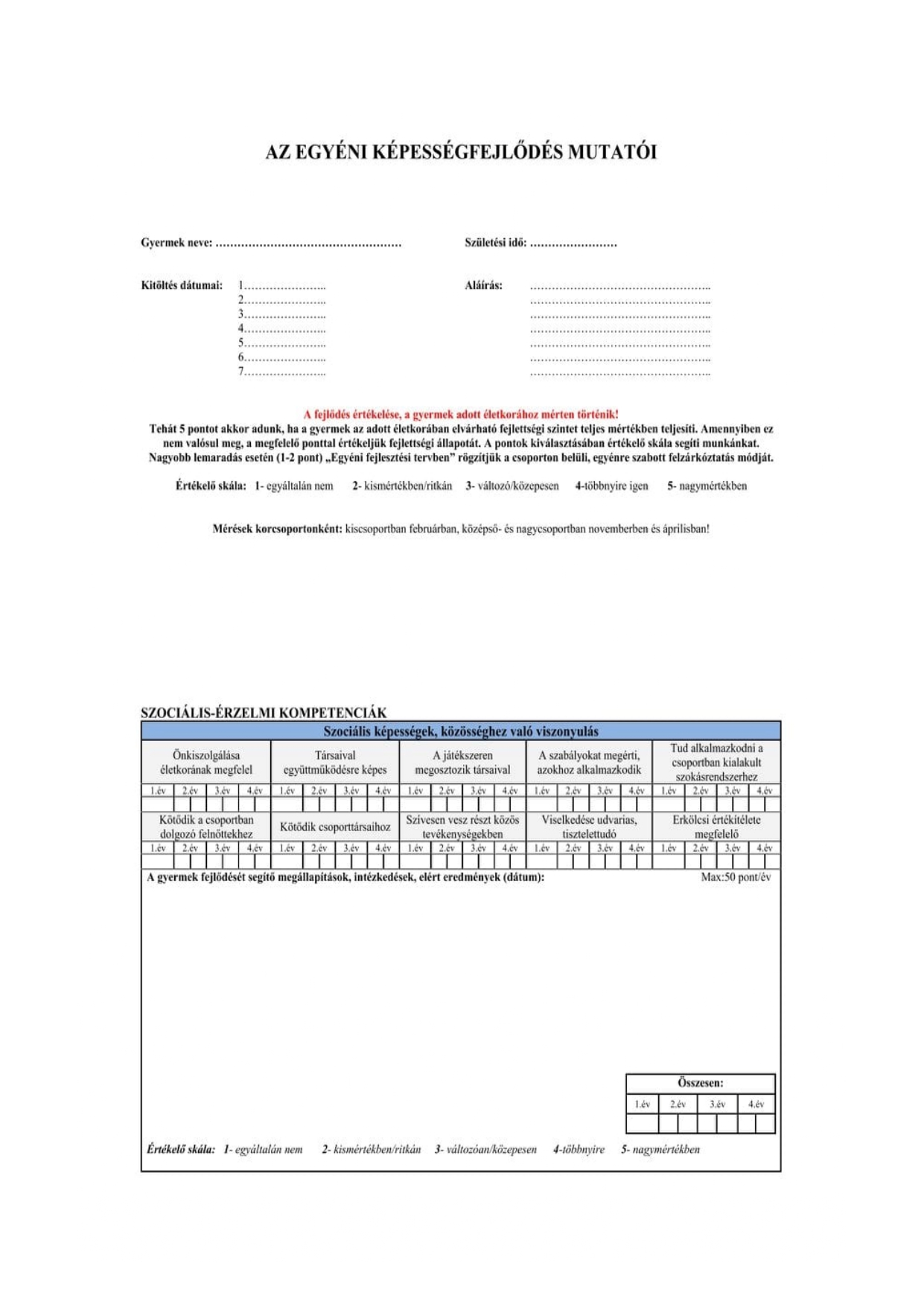 Megfigyeléseink, tapasztalataink folyamatos rögzítése - óvodakezdéskor egy, majd évente két alkalommal az egyéni fejlődési naplóban történik. Az értékelő skála segítségével 1-5 pont adható az egyes értékelési szempontokra, mellyel a gyermek adott életkorában elvárható fejlettségi szintet, illetve annak aktuális fokát értékeljük. 4 év tapasztalatainak dokumentálásra ad lehetőséget a táblázat. Az egyes kompetencia területek mutatóinak eredményét évente, átlagolt pont formájában összegezhetjük a lap alján lévő kis táblázatban, melyből a gyermek fejlődésének ütemét és irányát is leolvashatjuk.